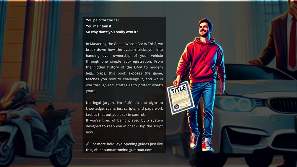 This guide breaks down how the DMV tricks you into handing over ownership—and shows you exactly how to take it back. Step-by-step strategies, real remedies, and tools to reclaim your title and protect your property for good. 🔓 Learn the game. Beat the trap. Own what’s yours.